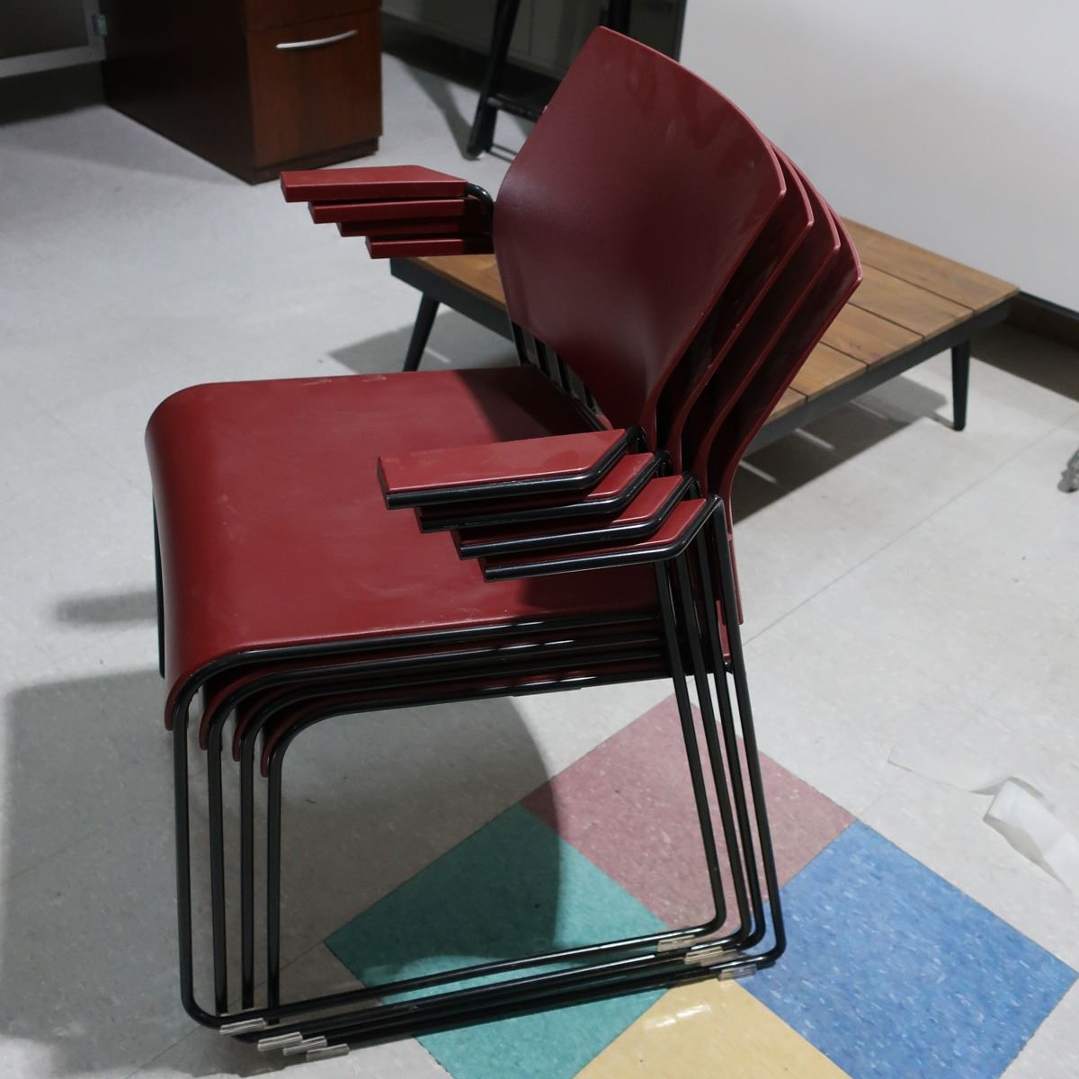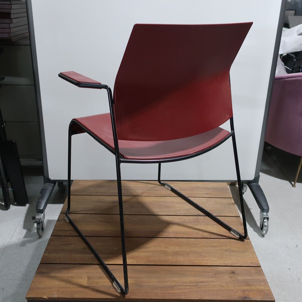 LOT: 4 STACKABLE ARMCHAIRS, BURGUNDY, METAL BASE
