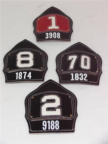 LOT (4) UNUSED CAIRNS FDNY LEATHER HELMET FRONTS;