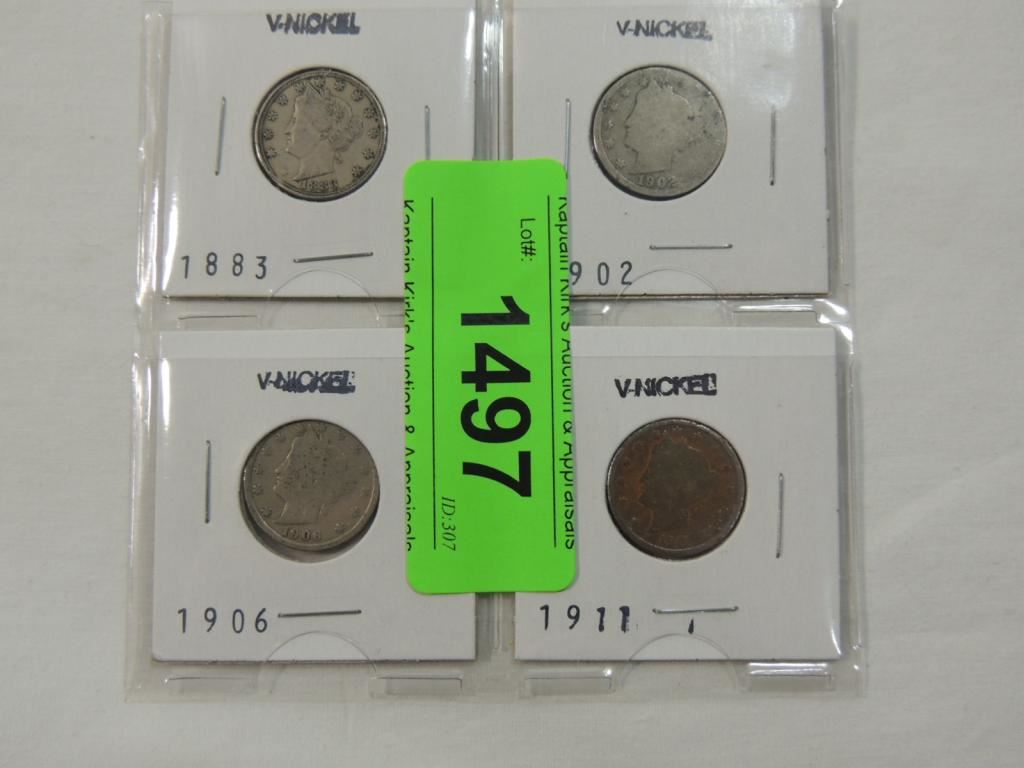 1883, 1902, 1906, 1911 V NICKELS OLD NICKELS US CURRENCY COIN COLLECTIBLE. AS SHOWN SEE PHOTO FOR MORE DETAILS.