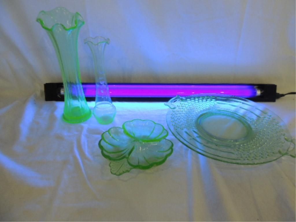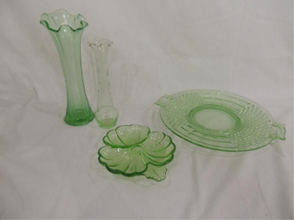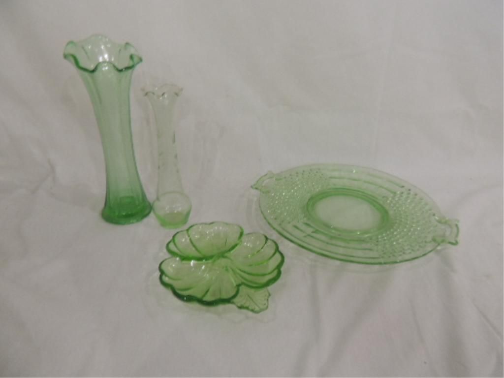 2 VASES SMALL DECORATIVE TRAY AND MEDIUM TRAY. VASELINE GLASS, URANIUM GLASS, PRIMROSE PEARLINE, DEPRESSION GLASS. ANTIQUE. RETRO-ERA. AS SHOWN. SEE PHOTO FOR MORE DETAILS
