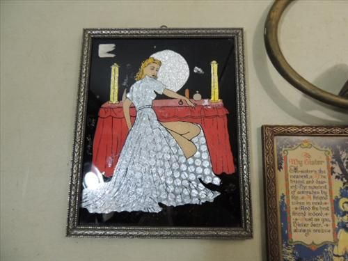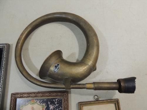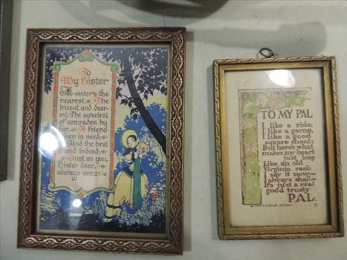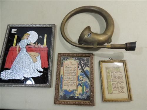 LOT 3 VINTAGE 1920S FRAMED (2) POEMS: EMMA KOEHLER & GIBSON, BRASS HORN FROM PAKISTAN. AS SHOWN. VIEW PICTURE FOR DETAIL.