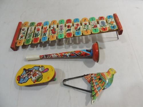 LOT 4 VINTAGE 1950S PRESS METAL TOYS & NOISE MAKERS. TWO MAKED: US METAL TOY CO. AS SHOWN. VIE WPICTURE FOR DETAIL.