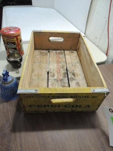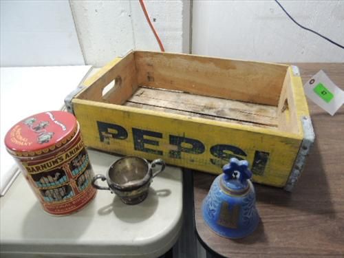 VINTAGE 24 BOTTLE PEPSI COLA WOOD CRATE, CHINA NOTRE DAME OF PARIS BELL. SILVER PLATED SUGAR BOWL, & ANIMAL CRAKER TIN. AS SHOWN. VIEW PICTURE FOR DETAIL.