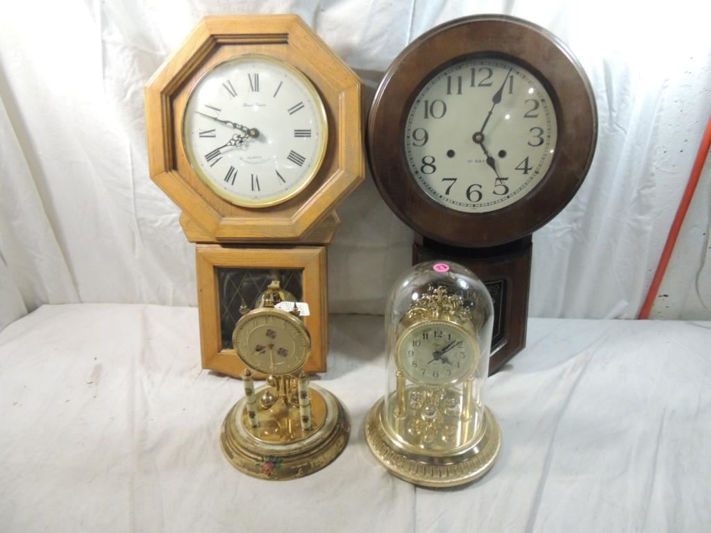 ASSORTED CLOCKS, NEED REPAIR, CLOCK PARTS, CASES, ANNIVERSARY CLOCKS, WALL CLOCKS, DECORATIVE CLOCKS, AS SHOWN SEE PHOTO FOR MORE DETAILS.