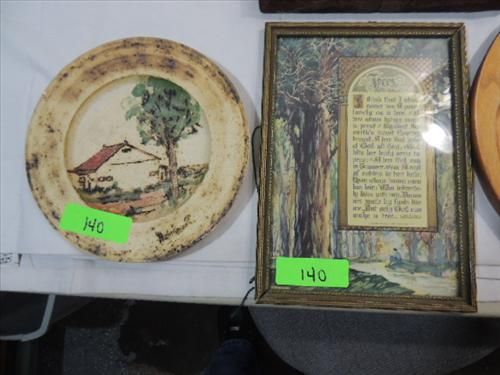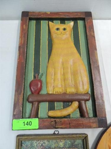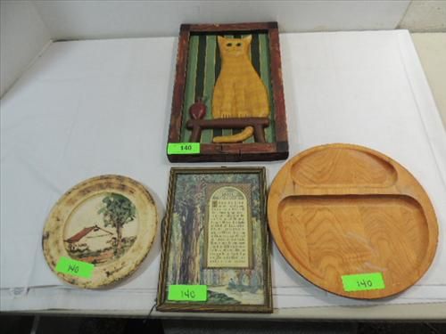 LOT 4 VINTAGE ASSORTED WALL HANGINGS: 1914 FRAMED TREE POEM, FRAMED CARVED WOOD CAT, CERAMIC PLATE AND MORE. AS SHOWN. VIEW PICTURE FOR DETAIL.