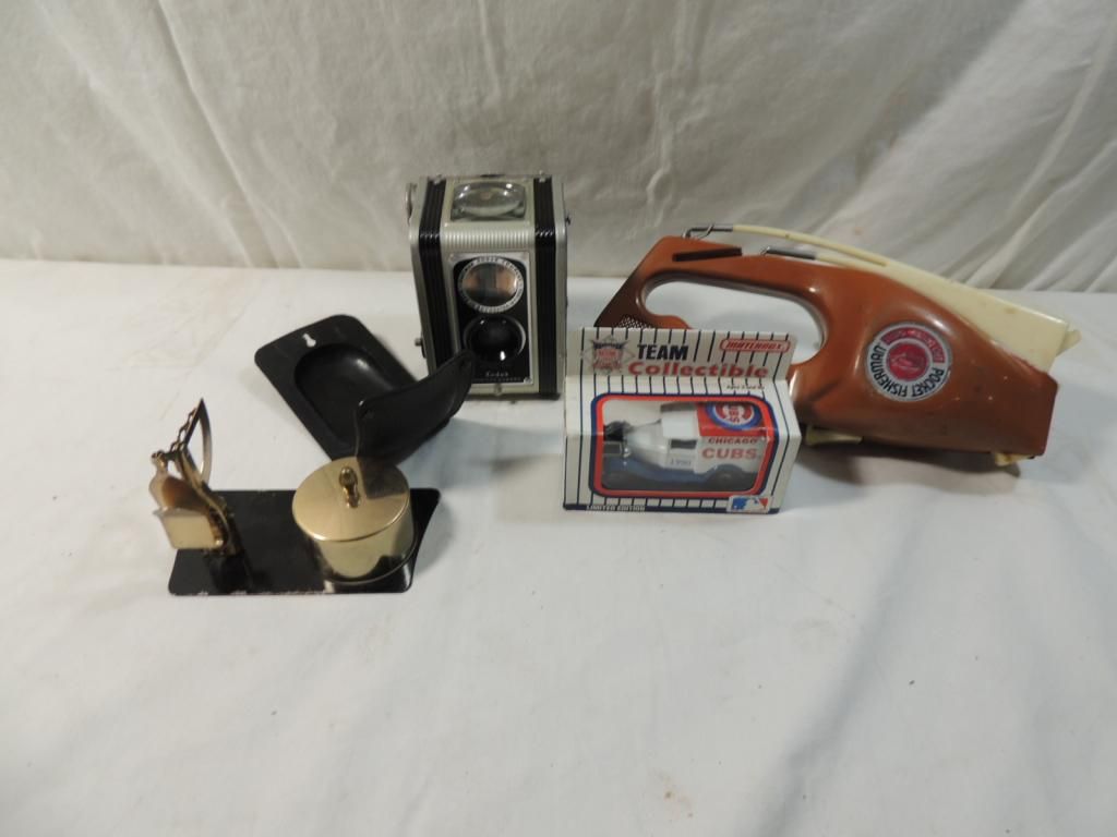 VINTAGE KODAK CAMERA, POCKET FISHERMAN SPIN CASGTING OUTFIT MATCHBOX TEAM COLLECTIBLE CHICAGO CUBS TRUCK. STAMP HOLDER AND SCALE AS SHOWN SEE PHOTO FOR MORE DETAILS.