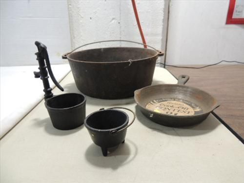 LOT 4 VINTAGE CAST IRON KETTLE, SKILLET & 2 MINIATURE KETTLE & WATER PUMP. AS SHOWN. VIEW PICTURE FOR DETAIL.