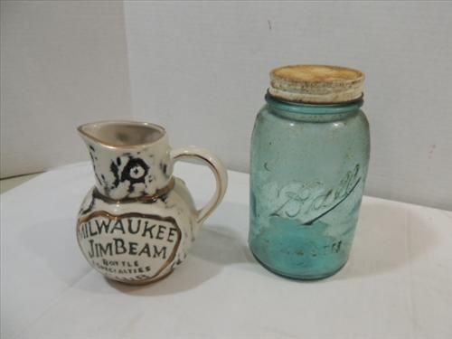 LOT 4 VINTAGE COLLECTIBLES: MILWAUKEE JIM BEAM CLUB CERAMIC PITCHER, BALL MASON JAR, DECORATIVE BATTLE CANNON AND METAL ART OF CHURCH. AS SHOWN. VIEW PICTURE FOR DETAIL.