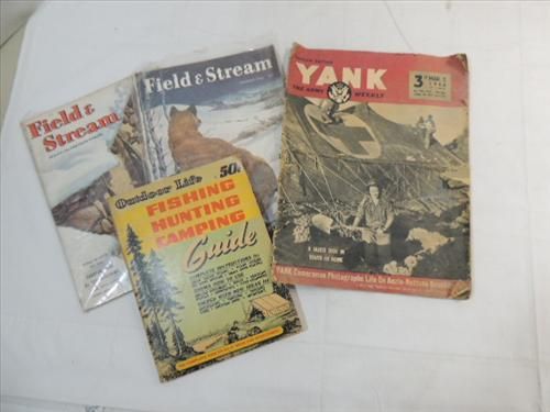 LOT 4 VINTAGE EMPHERIA (3) 1940 & 50S HUNTING MAGAZINES ( OUTDOOR LIFR, FIELD & STREAM). 1 WWII 3/5/1944 YANK MAGAZINE. AS SHOWN. VIEW PICTURE FOR DETAIL.