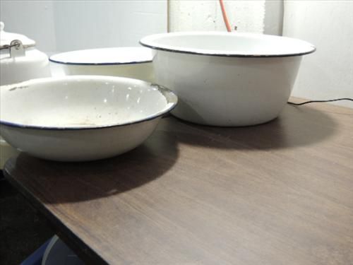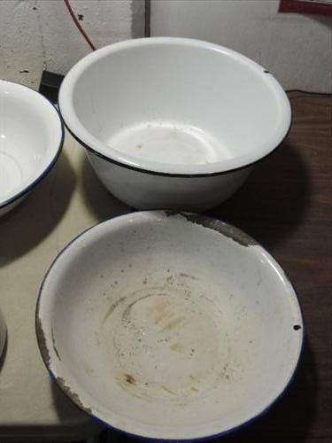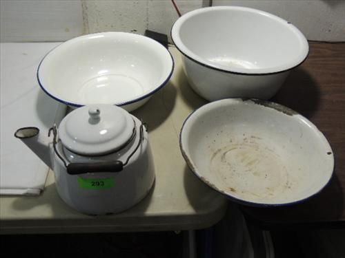 LOT 4 VINTAGE ENAMALWARE: 3 WASH BASINS & COFFEE POT. AS SHOWN. VIEW PICTURE FOR DETAIL.