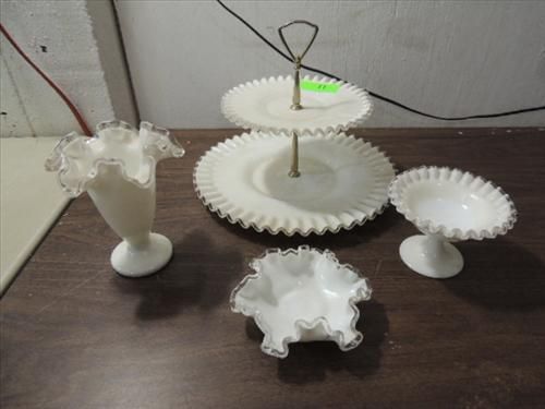LOT 4 VINTAGE MATCHING FENTON WHITE RUFFLED GLASSWARE: 2 TIERED SERVING TRAY, COMPOTE, NUT BOWL & VASE. AS SHOWN. VIEW PICTURE FOR DETAIL.