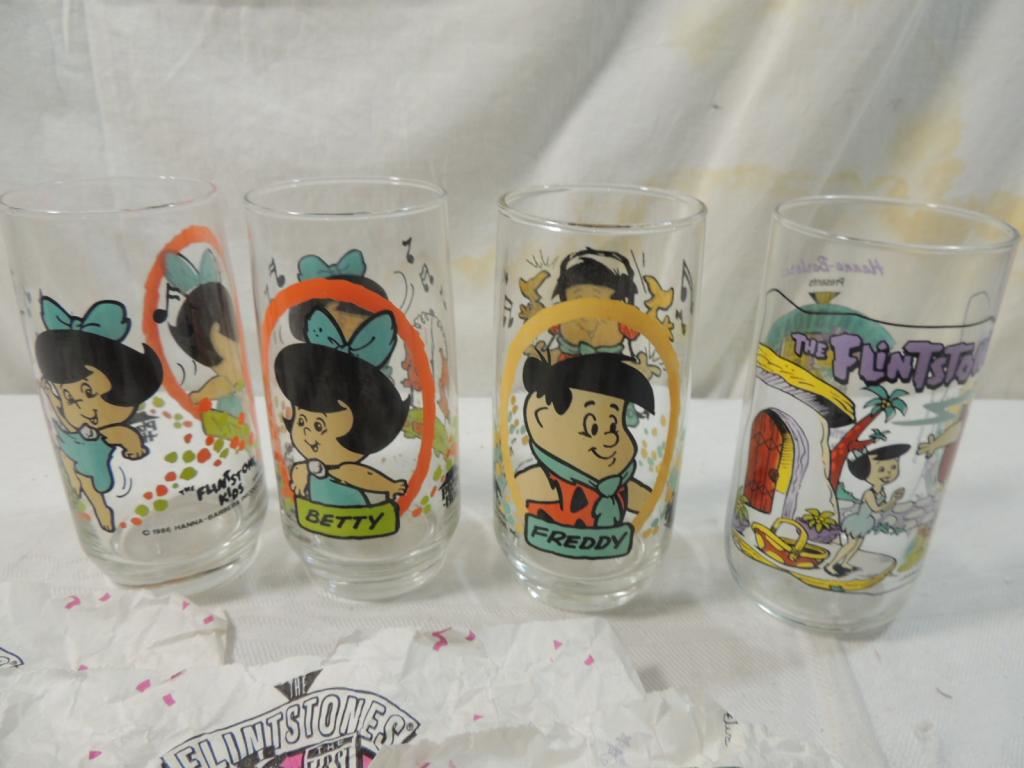 DRINKING GLASSES, FLINSTONE KIDS COLLECTORS CUPS, PIZZA HUT GLASSWARE, DECORATIVE GLASSWARE, FLINSTONES, HANNA BARBERA AS SHOWN SEE PHOTO FOR MORE DETAILS.