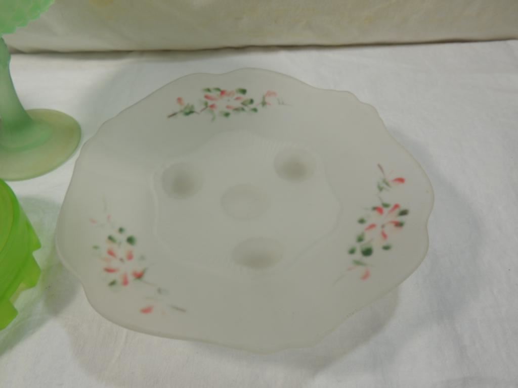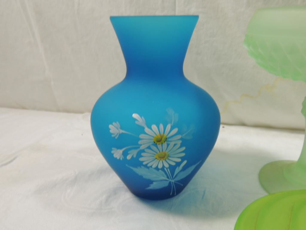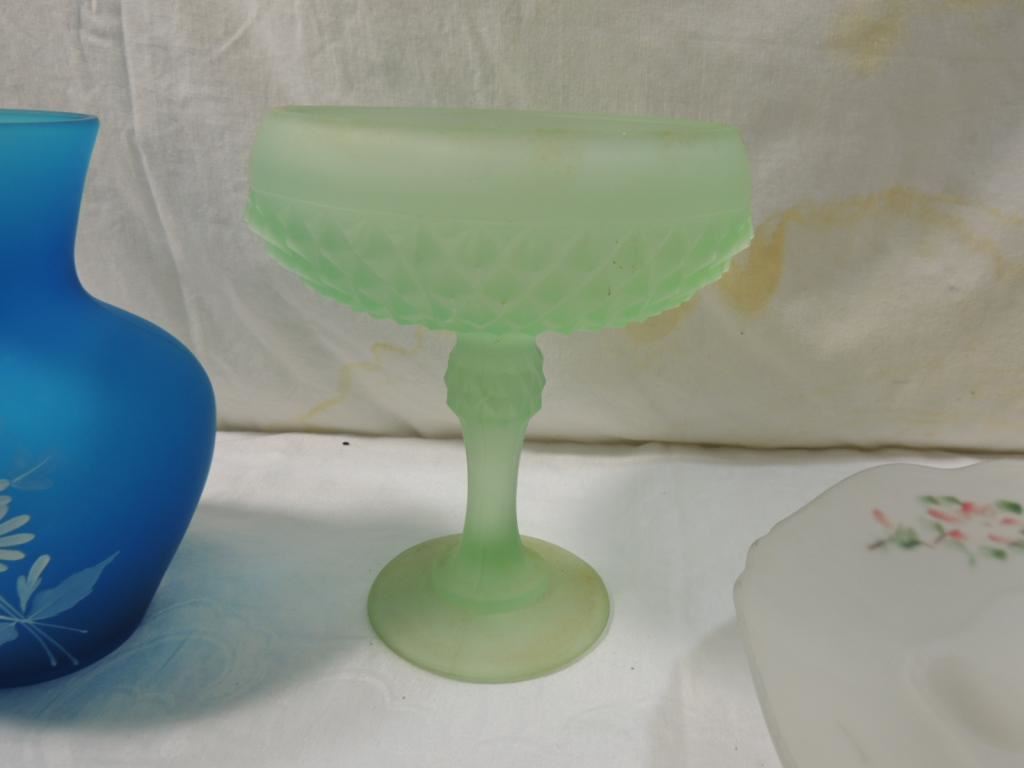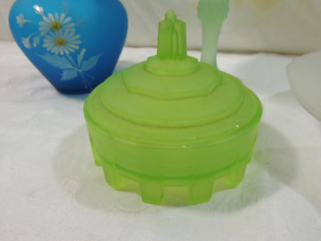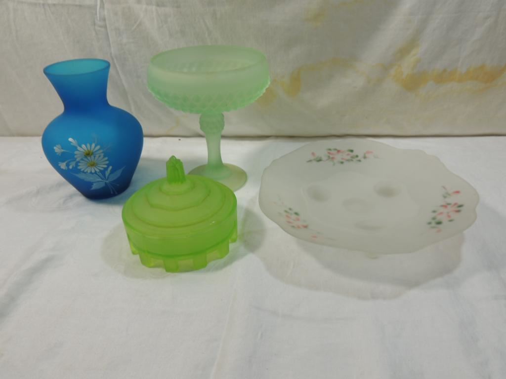 FROSTED GLASSWARE PEDISTAL CANDY DISH, PRESSED GLASS, FLORAL FOOTED PLATE, BLUE FROSTED VASE WITH PAINTED DAISIES, ART DECO LIDDED BOWL AS SHOWN SEE PHOTO FOR MORE DETAILS.