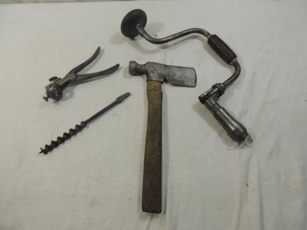HAND DRILL, VINTAGE HAMMER, CUTTER, VINTAGE ANTIQUE TOOLS, HAND TOOLS, AS SHOWN SEE PHOTO FOR MORE DETAILS.