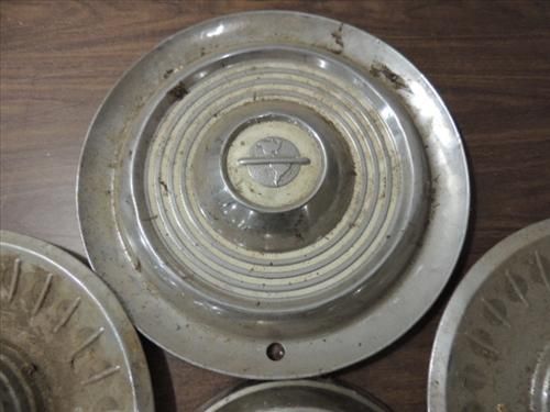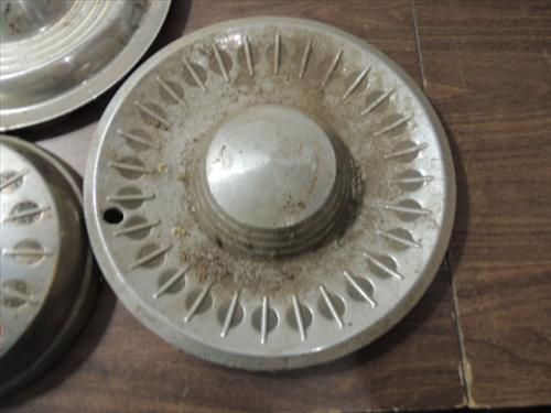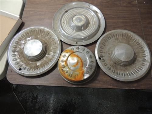 LOT 4 VINTAGE HUBCAPS: (2) 1962 PLYMOUTH VALIANT, 1 1960S PLYMOUTH TRUCK & 1 1950S HUBCAP. AS SHOWN. VIEW PICTURE FOR DETAIL.