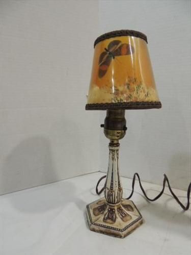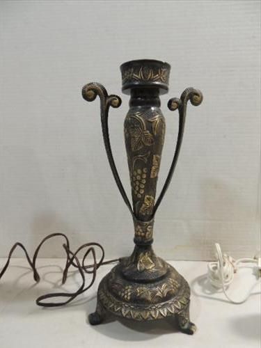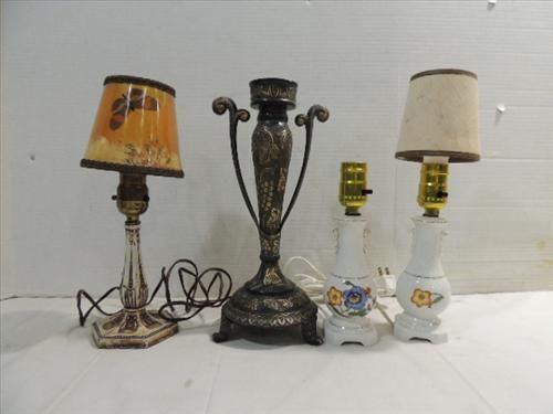 LOT 4 VINTAGE IETMS: 1 CAST IRON OLD LAMP, 2 CERAMIC CZECHSLOVAKIAN BED SIDE LAMPS AND BRASS CANDLE HOLDER. AS SHOWN. VIEW PICTURE FOR DETAIL.