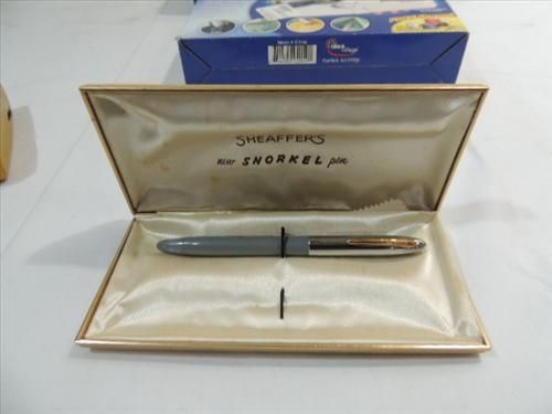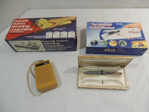 LOT 4 VINTAGE ITEMS: 2 HAND HELD SEWING MACHINES, 1 RCA TRANSITOR AM RADIO AND SHAEFFER FOUNTAIN PEN. AS SHOWN. VIEW PICTURE FOR DETAIL.