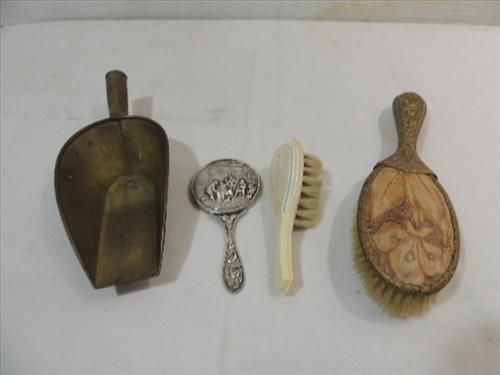 LOT 4 VINTAGE ITEMS: BRASS SCOOP, 2 OLD HAIR BRUSHES AND A SMALL METAL MIRROR. AS SHOWN. VIEW PICTURE FOR DETAIL.