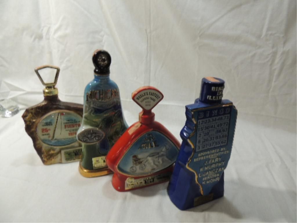 1975 VINTAGE JIM BEAM WHISKEY CERAMIC DECANTER: 100TH ANNIVERSARY THE RED MILE GREYHOUND. 1974 VINTAGE JIM BEAM WHISKEY CERAMIC DECANTER: 25TH ANNIVERSARY TRUTH OR CONSEQUENCES 1974 OLD MR BOSTON BOURBON CERAMIC DECANTER: BINGO IN ILLINOIS. 1972 VINTAGE JIM BEAM WHISKEY CERAMIC DECANTER: MICHIGAN GREAT LAKE STATE. AS SHOWN. VIEW PICTURE FOR DETAIL.