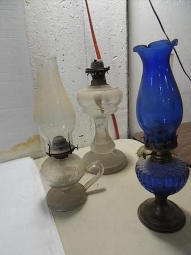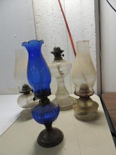 LOT 4 VINTAGE KEROSENE STORM LAMPS (1) COBALT BLUE BASE & CHIMNEY, 3 GLASS LAMPS 2 WITH CHIMNEY. AS SHOWN. VIEW PICTURE FOR DETAIL.