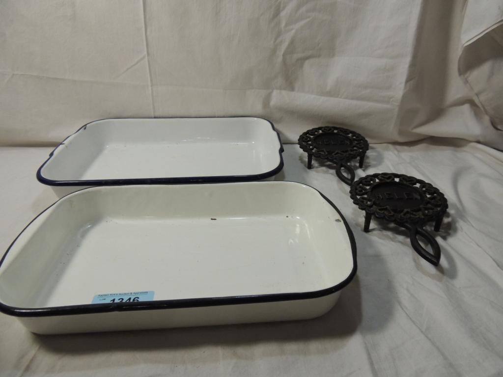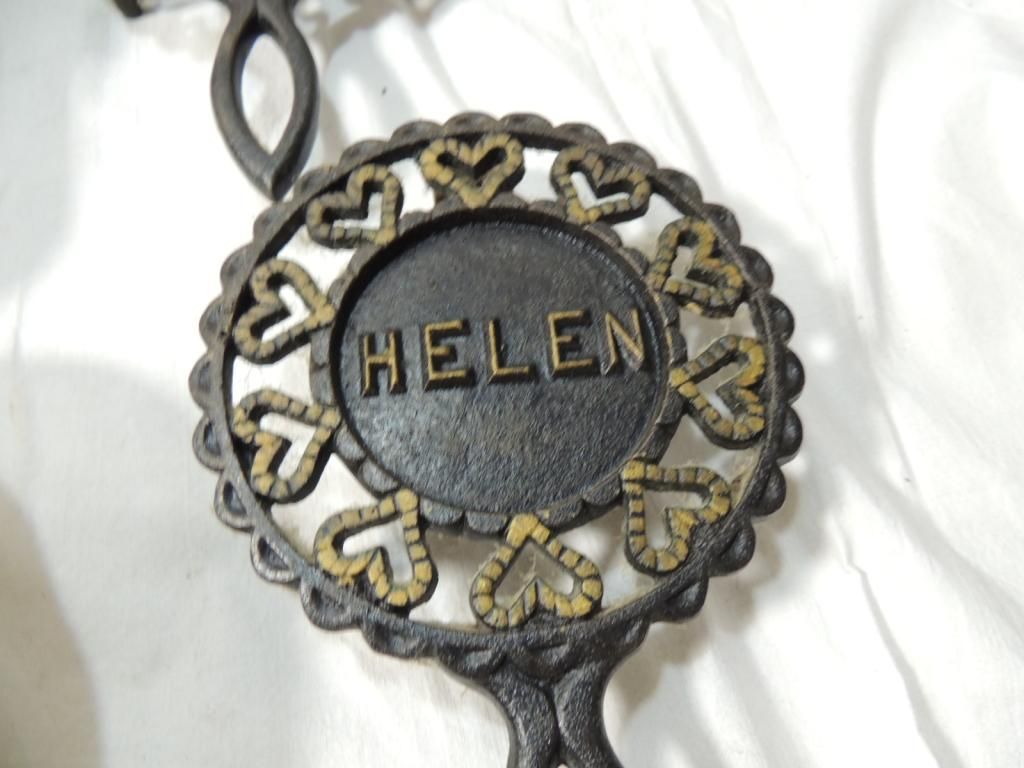 PAIR CAST IRON TRIVET. HELEN TRIVET. METAL CAKE PAN. TWO CAKE PANS. VINTAGE CAKE PAN. AS SHOWN. SEE PHOTO FOR MORE DETAILS.