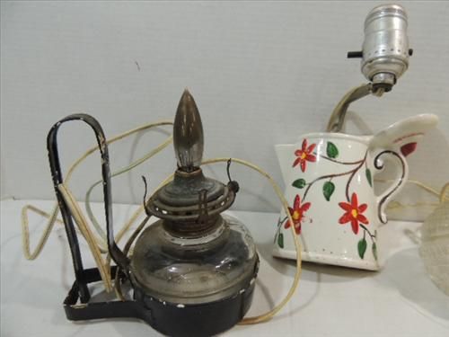 LOT 4 VINTAGE LAMPS: 1 CERAMIC WALL LAMP, 2 GLASS SIDE TABLE LAMPS AND A ELECTRIFIED OIL LAMP. AS SHOWN. VIEW PICTURE FOR DETAIL.