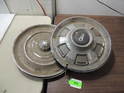 LOT 4 VINTAGE OLSMOBILE HUBCAPS: (2) 1956 OLDS & 2 1970S OLDS. AS SHOWN. VIEW PICTURE FOR DETAIL.