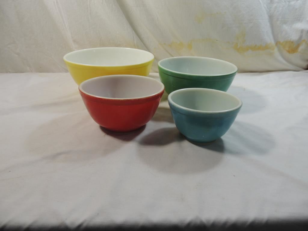 NESTING BOWLS MIXING BOWLS COLORFUL, COLLECTIBLE VINTAGE PYREX AS SHWON SEE PHOTO FOR MORE DETAILS.
