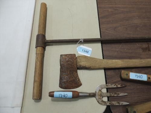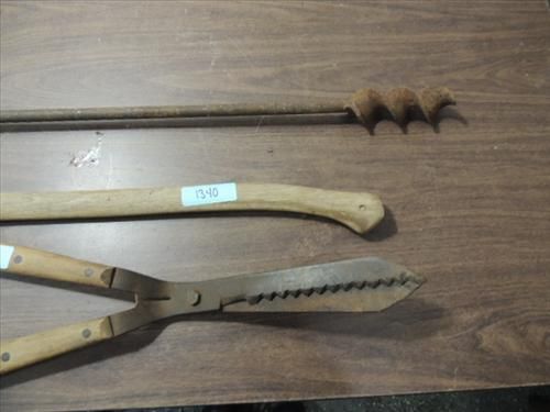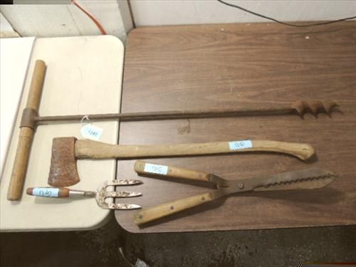 LOT 4 VINTAGE TOOLS: ANTIQUE BARN BEAM DRILL, AX, WEED TRIMMER, SOIL TURNER. AS SHOWN. VIEW PICTURE FOR DETAIL.
