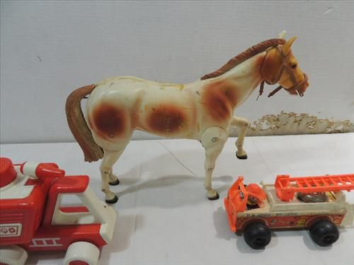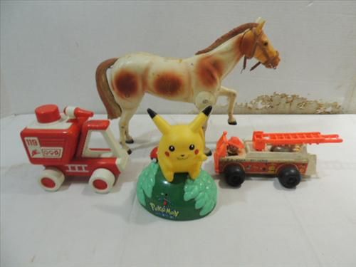 LOT 4 VINTAGE TOYS: FISHER-PRICE PULL FIRETRUCK, POSEABLE HORSE, TONKA YOUNG CHILD FIRETRUCK AND POKEMON CATCH THEM ALL TOY. AS SHOWN. VIEW PICTURE FOR DETAIL.