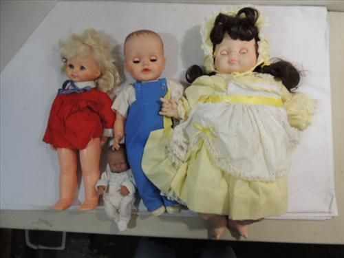 LOT 4 VINTAGE VINYLE DOLLS: 1965 VOGUE, 1970 HORSEMAN, AND 2 UNMARKED DOLLS. AS SHOWN. VIEW PICTURE FOR DETAIL.