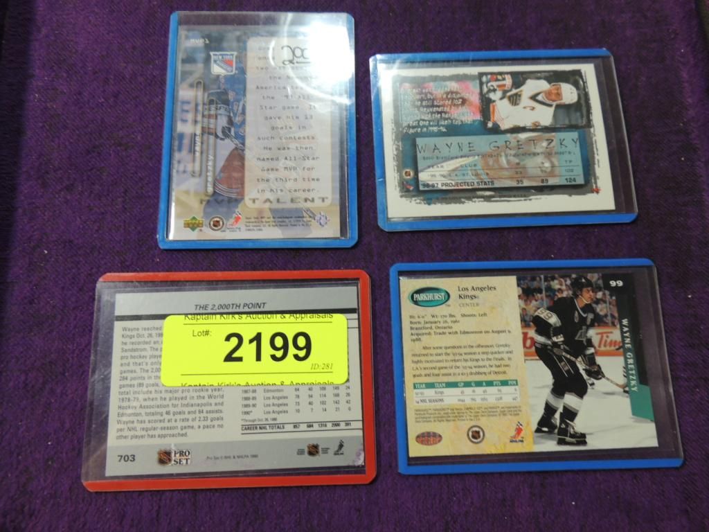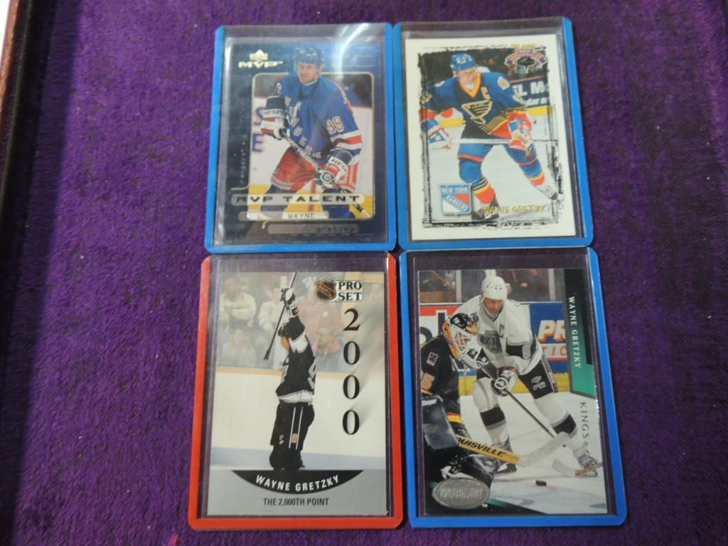 WAYNE GRETZKY HOCKEY PLAYER CARDS. PARKEHURST #99, UPPER DECK #MVP1, FLEER # 8, 2000 PROSET 2000TH POINT #703. MIXED YEARS. TRADING CARDS. GREAT CONDITION. IN PROTECTIVE PLASTIC SLEEVES