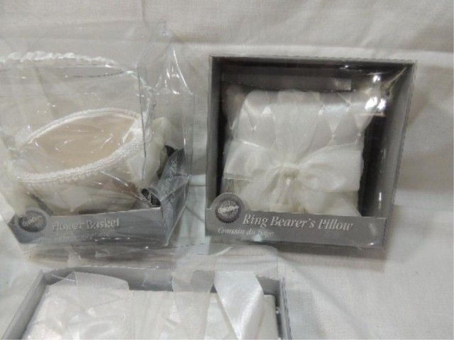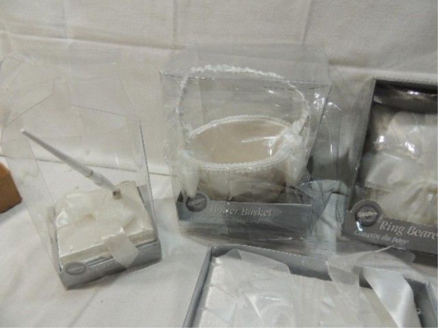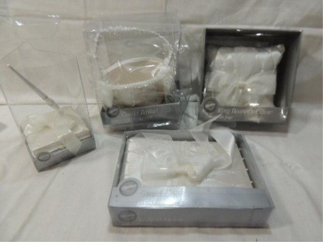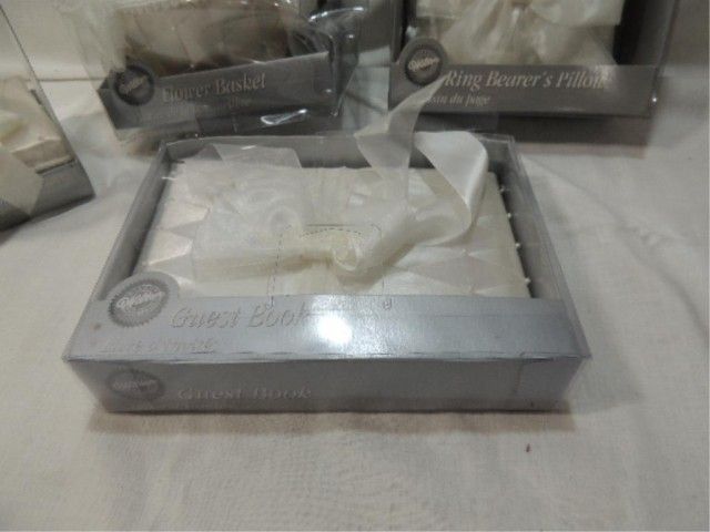 LOT 4 WILTON WEDDING NECESSITIES: RING BEARER PILLOW, GUST BOOK, GUEST BOOK PEN & HOLDER, FLOWER BASKET. AS SHOWN. VIEW PICTURE FOR DETAIL.