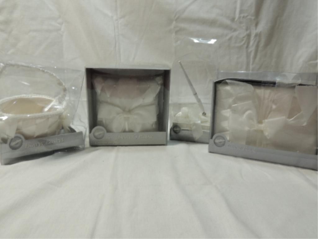 LOT 4 WILTON WEDDING NECESSITIES: RING BEARER PILLOW, GUEST BOOK PEN & HOLDER, FLOWER BASKET. AS SHOWN. VIEW PICTURE FOR DETAIL.