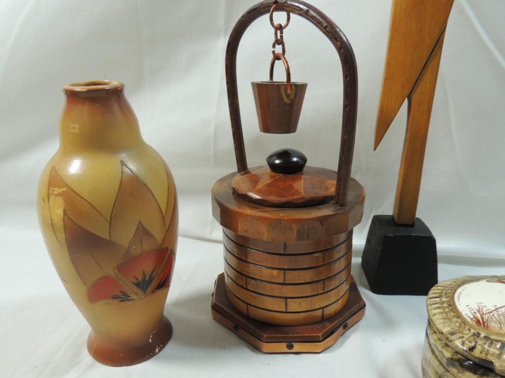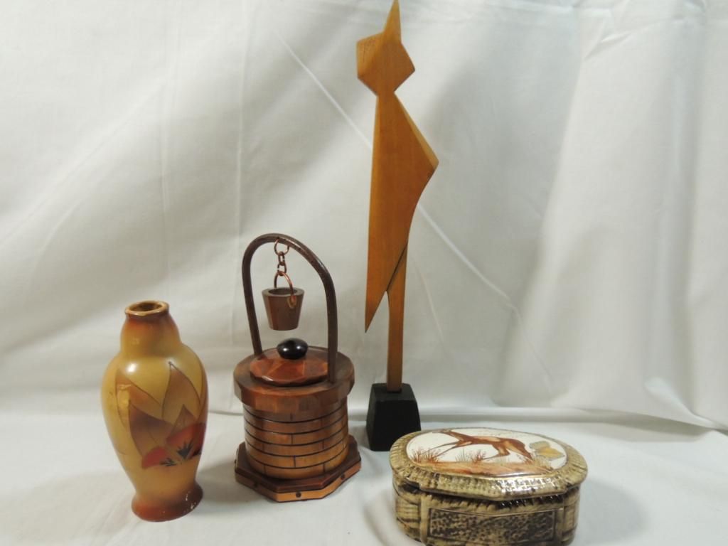 WOODEN WISHING WELL. VASE. ABSTRACT BIRD SCULPTOR, CERAMIC VINTAGE PAINTED BOX. AS SHOWN. SEE PHOTO FOR MORE DETAILS.