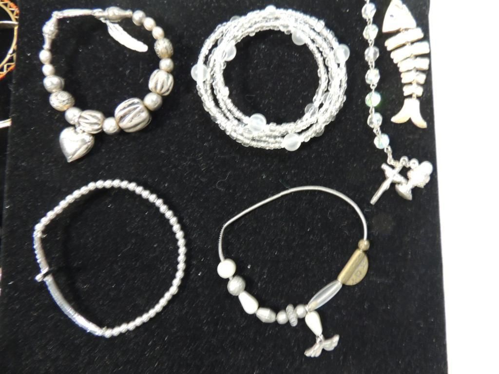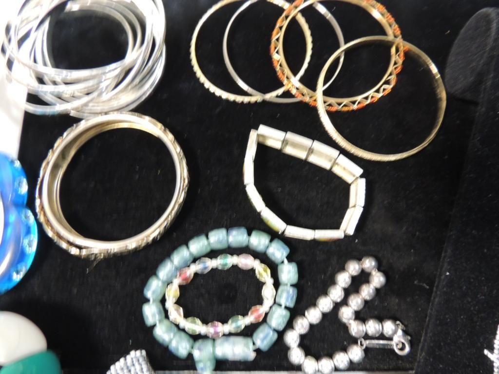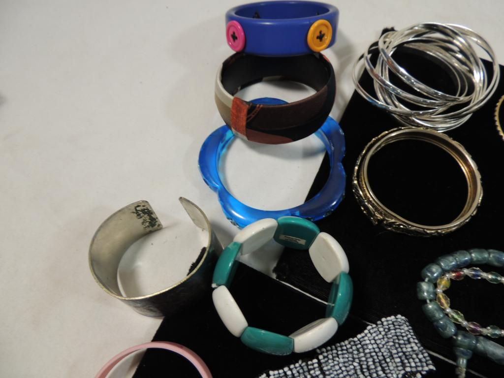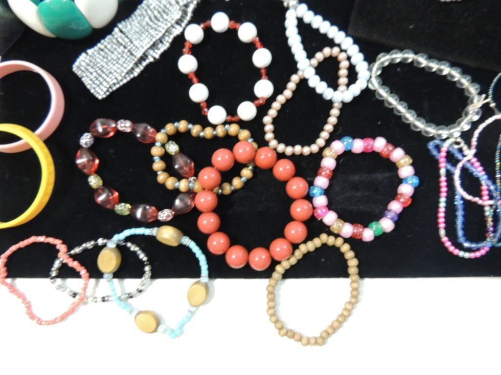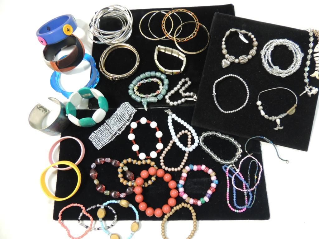 ASSORTED BRACELETS BEADED BRACELETS CUFF BRACELETS PROMOTIONAL BRACELETS SILVERTONE GOLDTONE BANGLES AS SHOWN SEE PHOTO FOR MORE DETAILS.