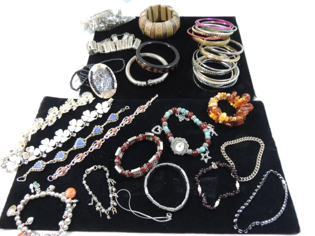 GOLDTONE, SILVERTONE, BEADED, BANGLES, STACKABLE, MULTI STRAND, PLASTIC, STRECH, FASHION JEWELRY, COSTUME JEWELRY, AS SHOWN SEE PHOTO FOR MORE DETAILS.
