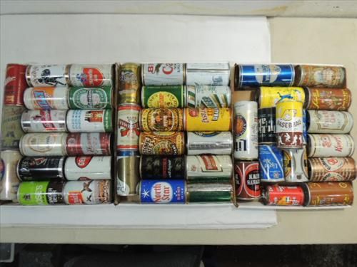 LOT 46 VINTAGE BEER CANS: PULL TAB, SELF OPEN, FLAT TOP: BILLY, O'KEEFE, GENESEE, PABST, SCHMIDT, KINGSBURY, WHITBREAD, BALLANTINE, FINLANDIA BLUE, SCHELL'S, BILLY, O'KEEFE, GENESEE, PABST, SCHMIDT AND MORE. AS SHOWN. VIEW PICTURE FOR DETAIL.