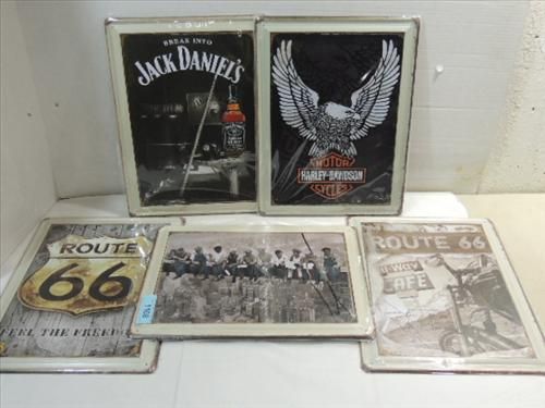 LOT 5 16X12 PRESS METAL CLASSIC AMERICAN IMAGES: HARLEY-DAVIDSON, JACK DANIELS, ROUTE 66 AND 1930S SKYSCRAPER CONSTRUCTION. AS SHOWN. VIEW PICTURE FOR DETAIL.