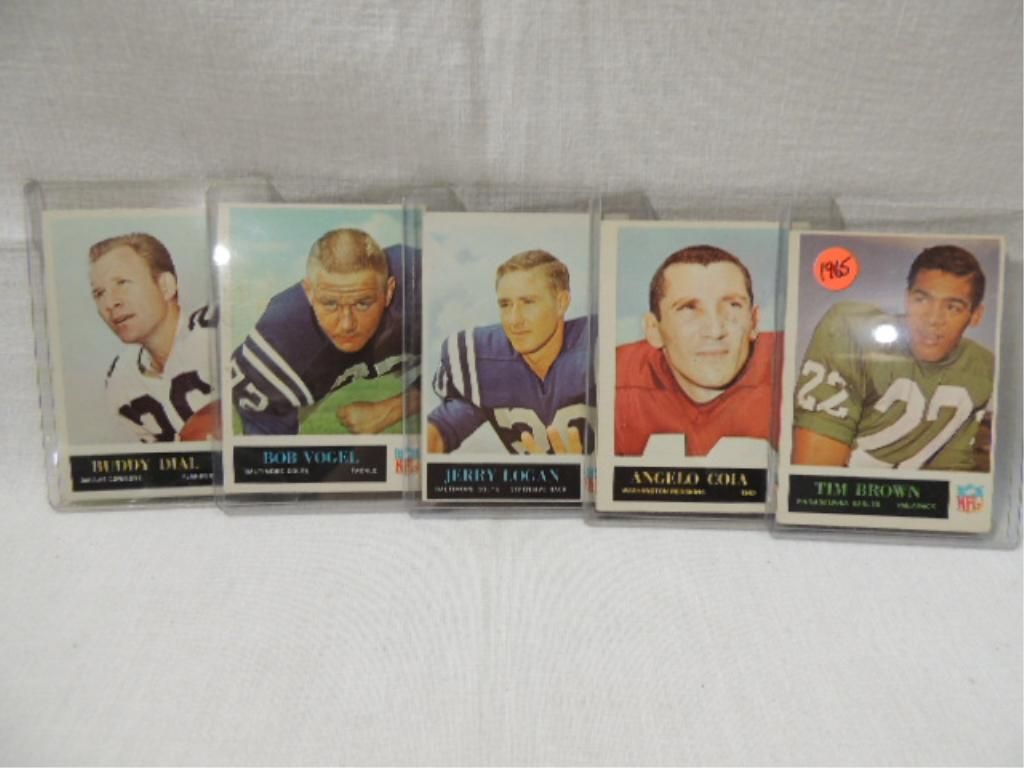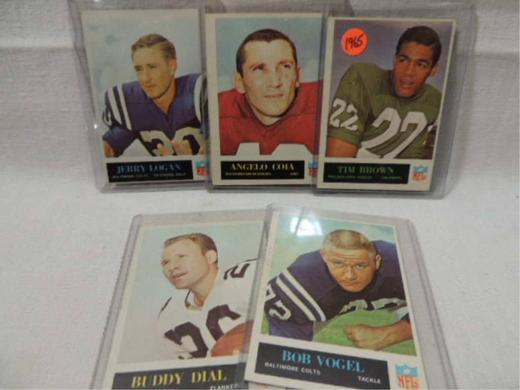 LOT 5 1965 NFL FOOTBALL PLAYER CARDS. TIM BROWN. ANGELO COLA. JERRY LOGAN. BOB VOGEL. BUDDY DIAL. AS SHOWN. SEE PHOTOS FOR DETAILS.