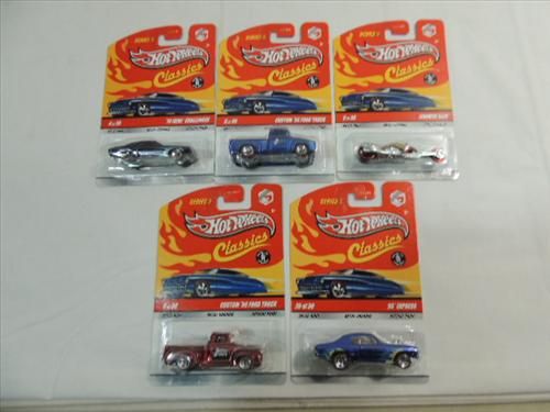 LOT 5 2008 CLASSIC HOT WHEELS SERIES 5: SS EXPRESS, 56 FORD TRUCK, 70 CHALLENGER, HAMMER SLED AND 56 FORD TRUCK. AS SHOWN. VIEW PICTURE FOR DETAIL.