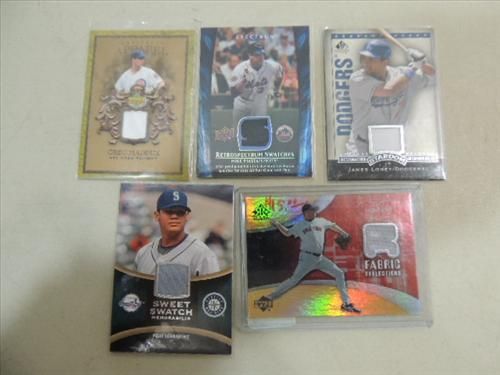 LOT 5 2008 UPPER DECK JERSEY SEGMENT BASEBALL CARDS: CRAIG MADDUX, MIKE PIAZZA, CURT SCHILLING. AS SHOWN. VIEW PICTURE FOR DETAIL.