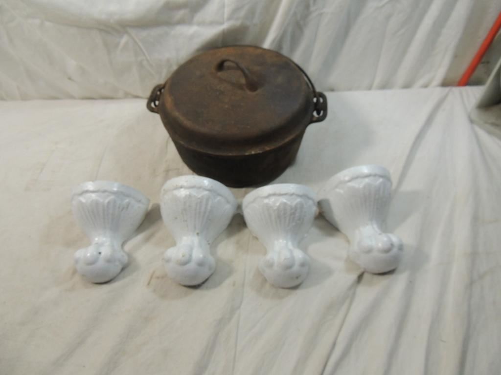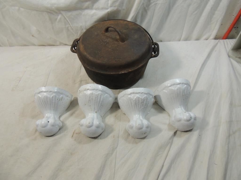 CAST IRON CLAW FOOR, TUB CLAW FOOT, ANTIQUE CLAW FOOT, CAST IRON COVERED POT, KETTLE HEAVY DUTY, AS SHOWN SEE PHOTO FOR MORE DETAILS.
