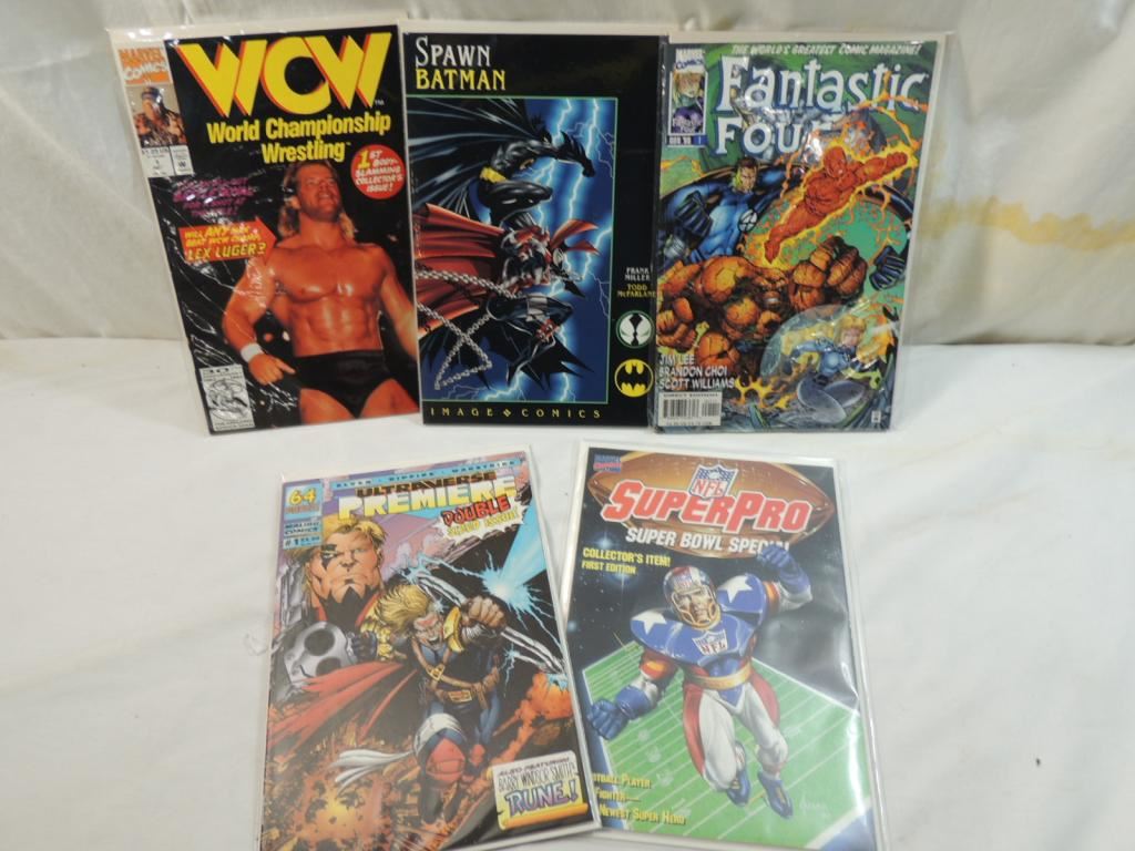 NFL SUPERPRO SUPER BOWL SPECIAL 1ST ISSUE MARCH 1991, ULTRAVERSE PREMIER #1 DOUBLE SIZED ISSUE 1ST ISSUE MARCH 1994, MARVEL FANTASIC FOUR #1 FIRST ISSUE NOV. 1996, SPAWN BATMAN 1ST ISSUE 1994, WCW WORLD CHAMPIONSHIP WRESTLING 1ST ISSUE APRIL 1992, COLLECTIBLE GREAT CONDITION, PLASTIC SLEEVE AND BOARD, AS SHOWN SEE PHOTO FOR MORE DETAILS.