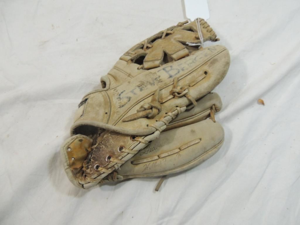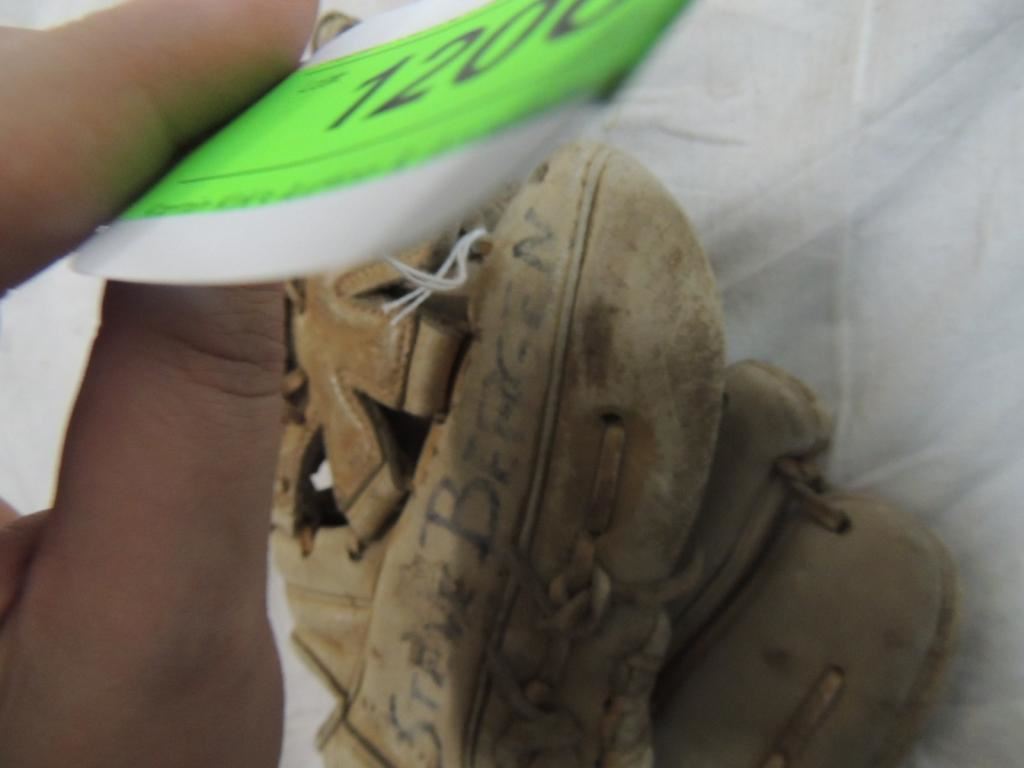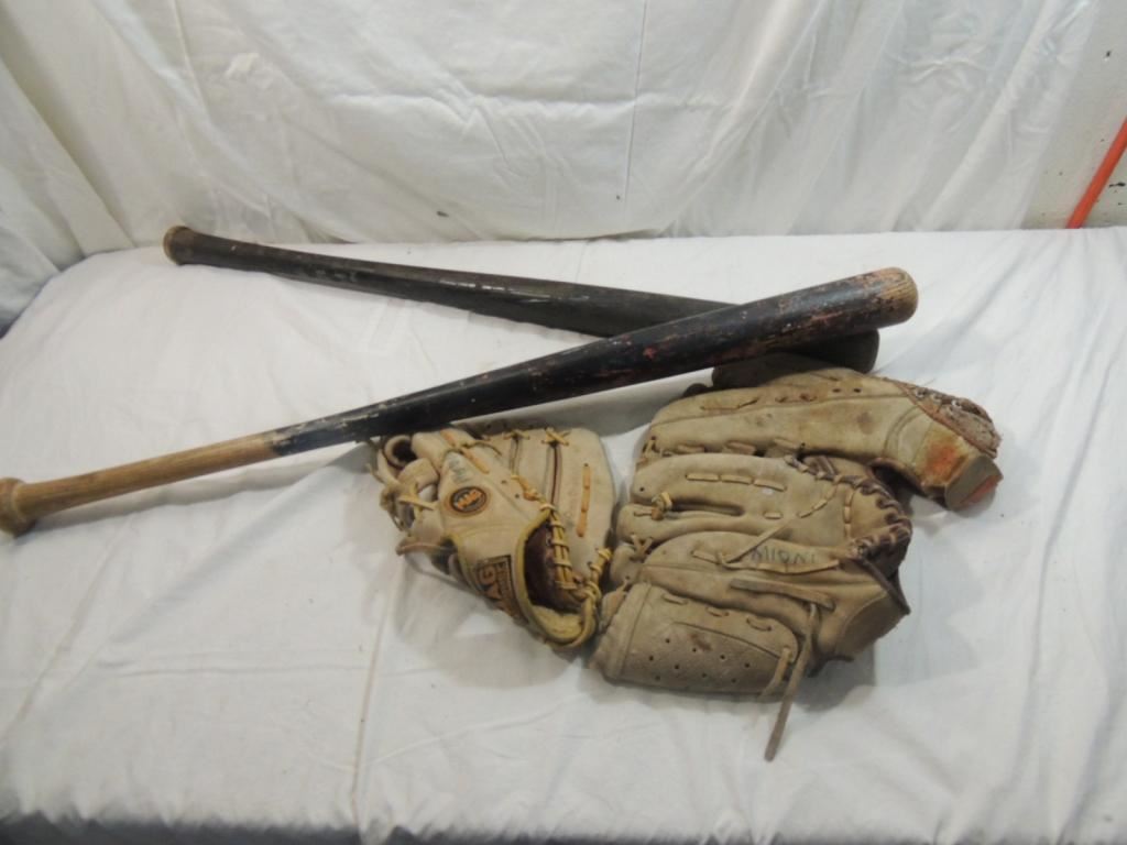 BASEBALL GLOVES, BASEBALL BATS, SPORTS EQUIPMENT, COLLECTIBLE SPORTS EQUIPMENT, VINTAGE BASEBALL EQUIPMENT AS SHOWN SEE PHOTO FOR MORE DETAILS.