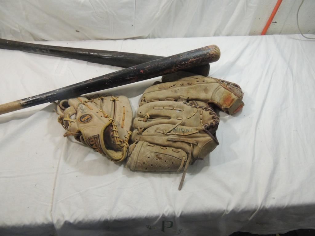 BASEBALL GLOVES, BASEBALL BATS, SPORTS EQUIPMENT, COLLECTIBLE SPORTS EQUIPMENT, VINTAGE BASEBALL EQUIPMENT AS SHOWN SEE PHOTO FOR MORE DETAILS.