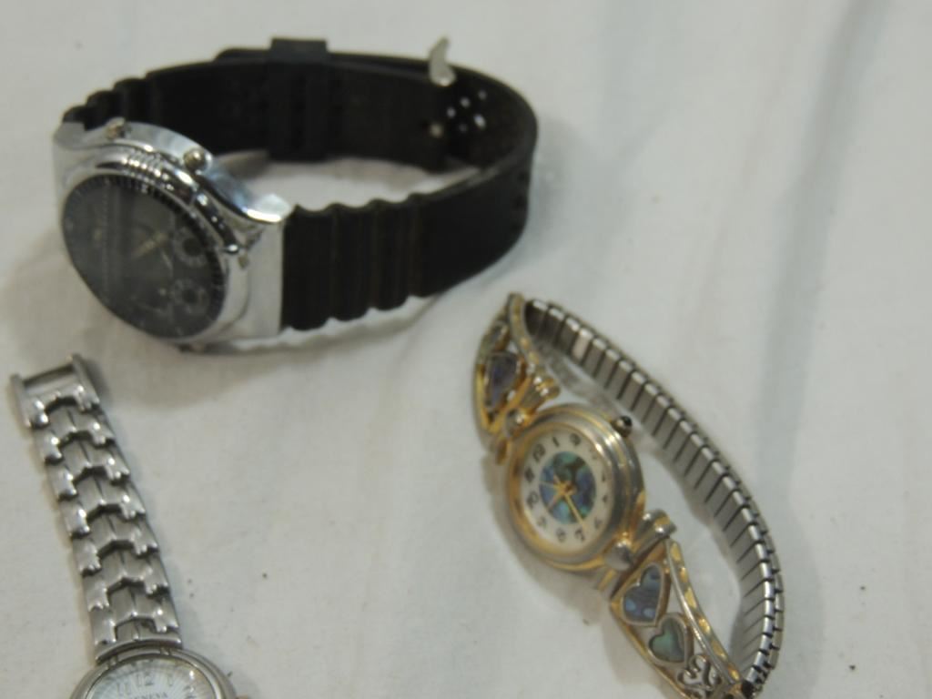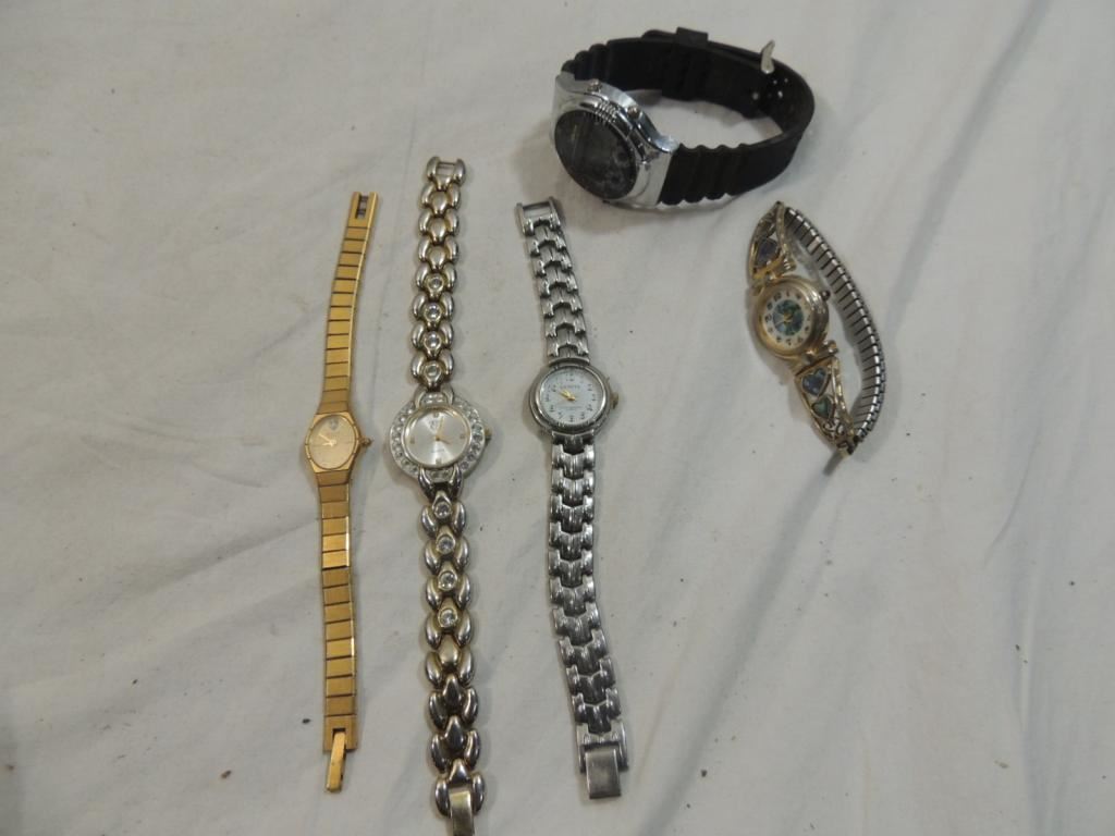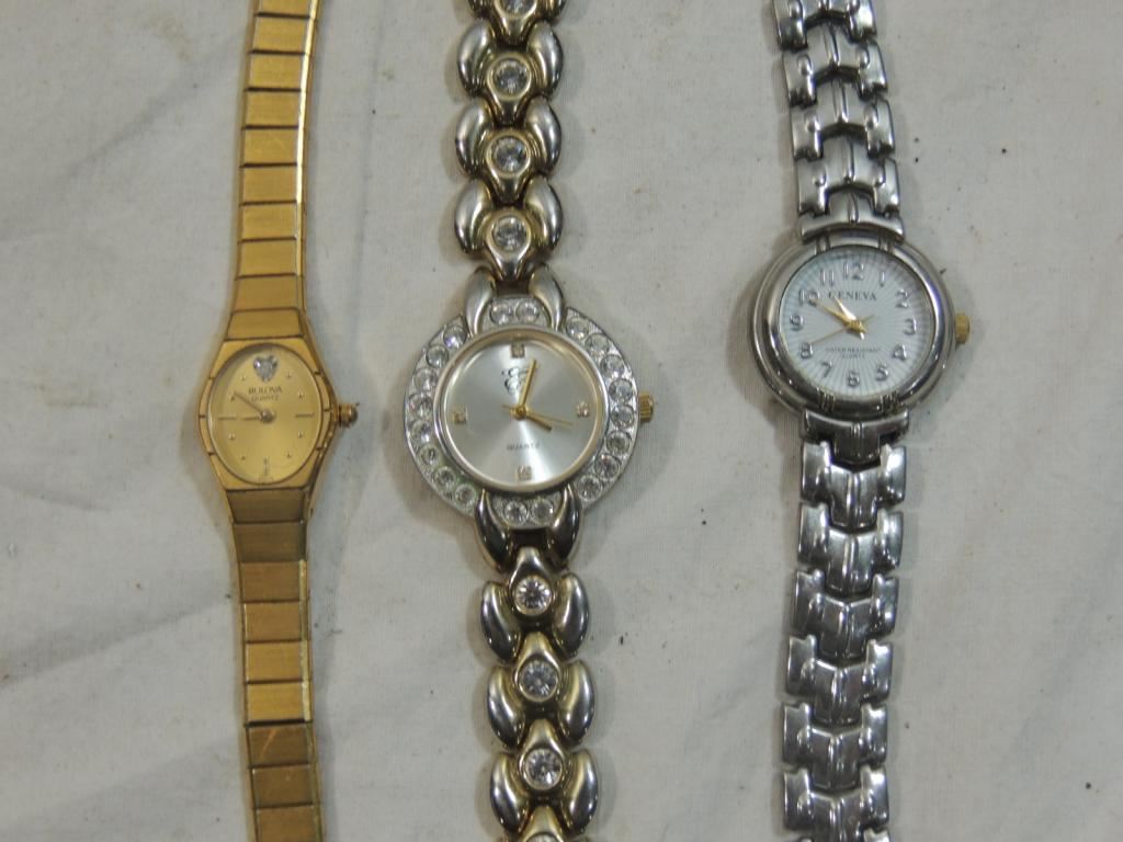 GENEVA, BULOVA, WRANGLER, LADIES AND MENS WATCHES, GOLDTONE, SILVERTONE, AS SHOWN SEE PHOTO FOR MORE DETAILS.