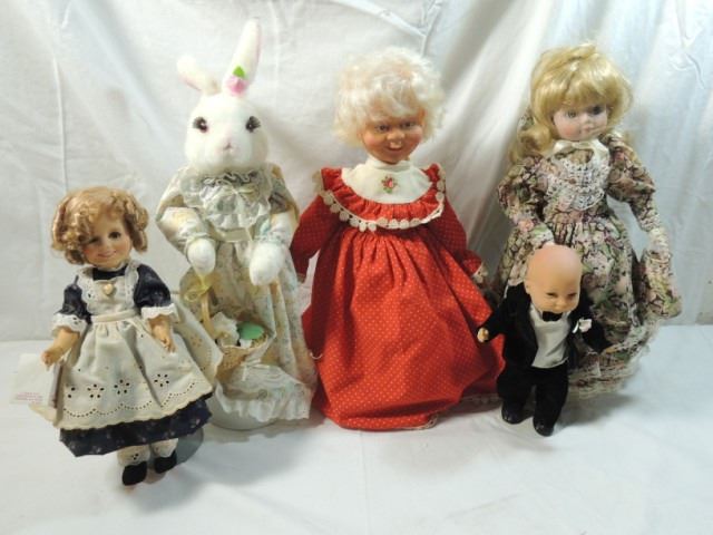 DOLLS ON STANDS, DECORATIVE DOLLS, VINTAGE DOLLS, COLLECTIBLE DOLLS, AS SHOWN SEE PHOTO FOR MORE DETAILS