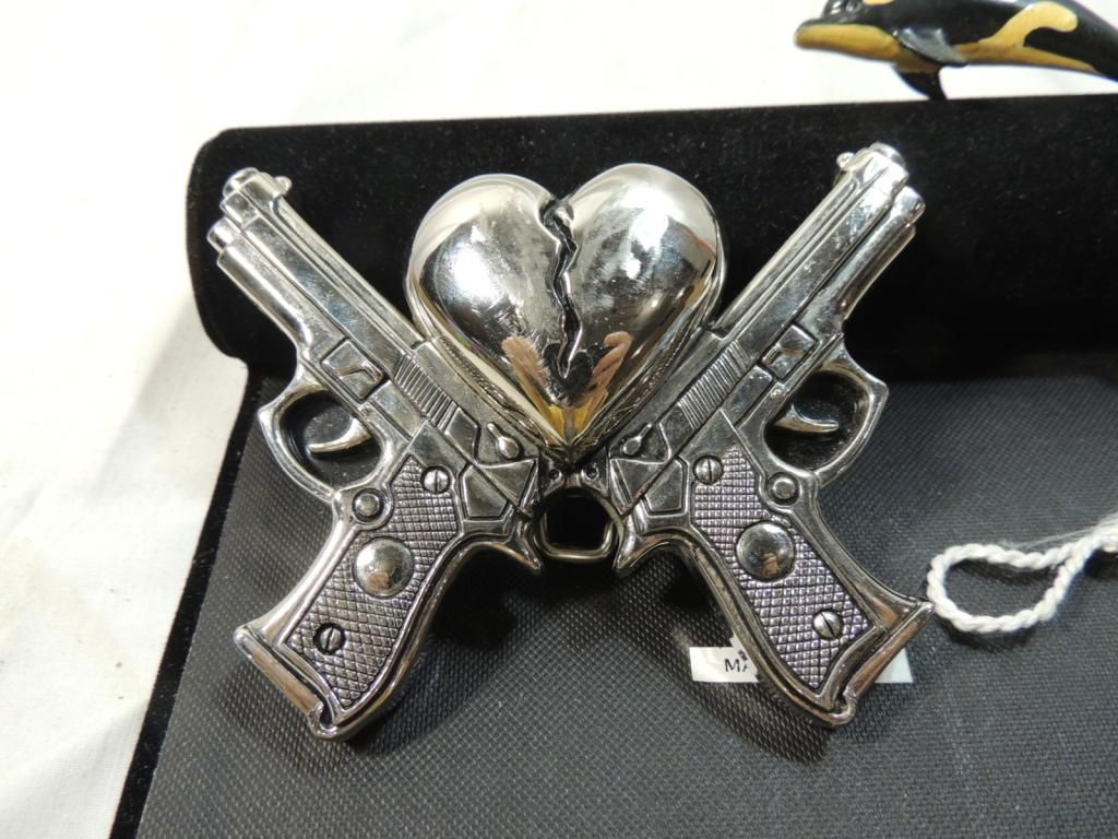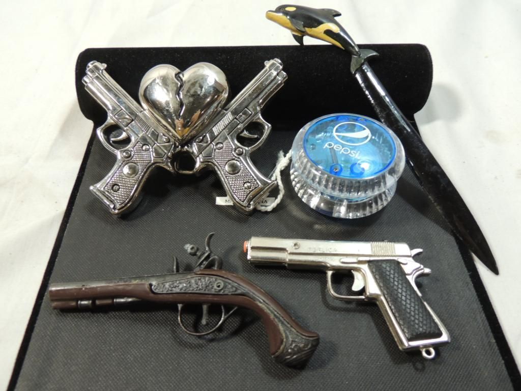 PEPSI YO-YO, GUN AND BROKEN HEART BELT BUCKLE, WHALE LETTER OPENER, REPLICA TOY SMALL GUN, REPLICA ANTIQUE SMALL TOY GUN. AS SHOWN. SEE PHOTO FOR MORE DETAILS.