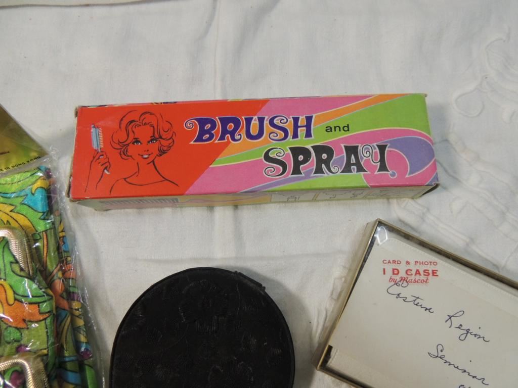 COSMETIC, PURSE ACCESSORY SET, POCKET MIRROR, BRUSH AND SPRAY, ID CASE CARD AND PHOTO WALLET, AS SHOWN SEE PHOTO FOR MORE DETAILS.